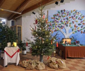 Die Aula war geschückt und wie imemr standen auch Krippe und Adventskranz.