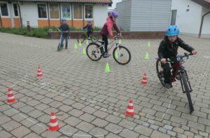 Eine Woche im Jahr stellt uns die Verkehrswacht einen Verkhrsanhänger zur Verfügung, mit dem alle Klassen im Schonraum üben können.